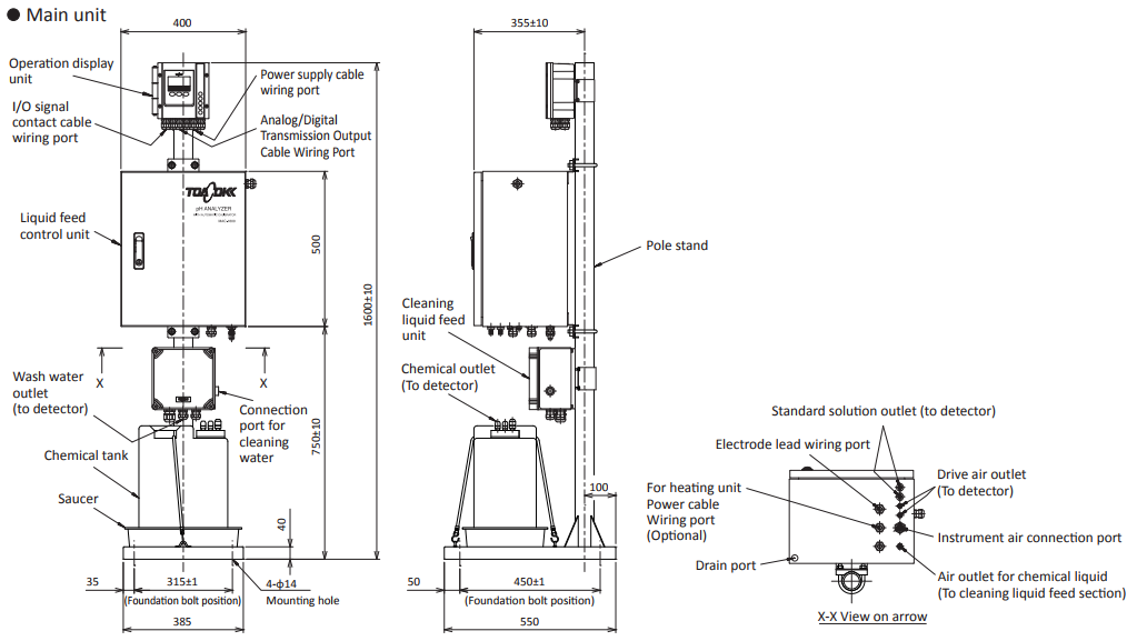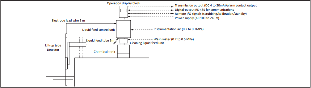 자동 세척 및 교정은 기기의 캘린더 타이머로 시작할 수 있습니다. 이는 제어실의 시작 신호에 의해 수행될 수 있으며, 세척 또는 교정 중에 응답 신호를 출력합니다. 또한, 플랜트가 중단될 때 전극이 더럽혀지지 않도록 들어올리기 위한 대기 작업 지시를 내릴 수 있으며, 이때 대기 중에 회신 신호를 출력합니다.